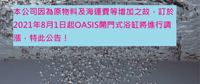 月1日起OASIS開門式浴缸將進行調漲,特此公告!