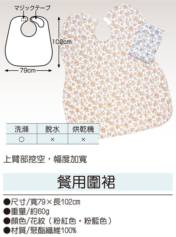 ●尺寸/寬79×長102cm ●重量/約60g ●BC051F-12B-餐用圍兜79*102-藍花/ BC051F-12P-餐用圍兜79*102-粉花 ●材質/聚酯纖維100%