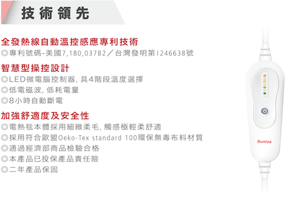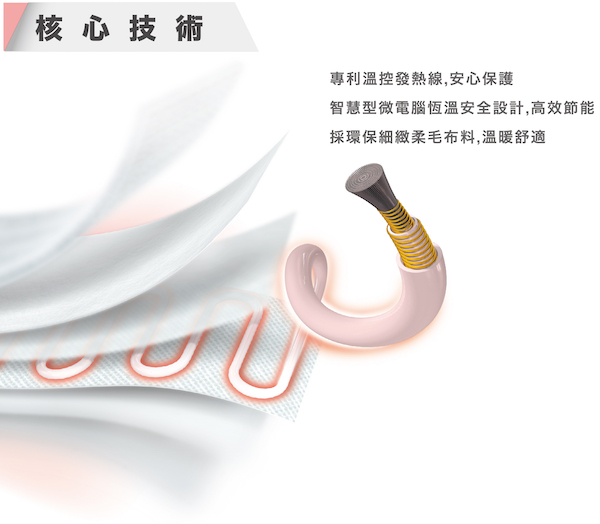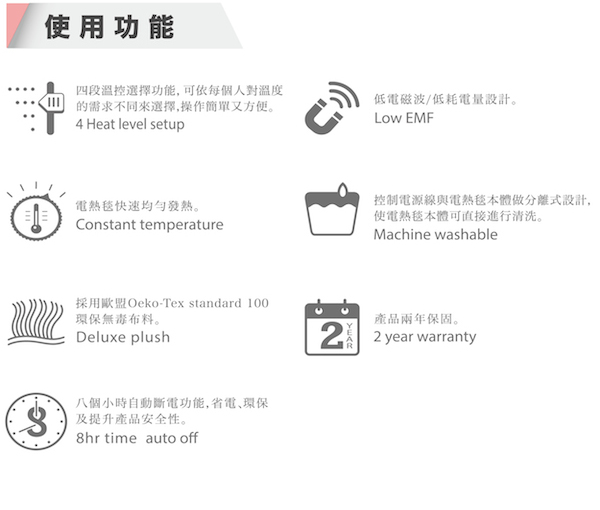 1. 全開式鋪墊使用,適合大範圍保暖(140cm x 80cm) 2. 安全-發熱線具保護控溫自動感應安全設計,獲多國專利 3. 便利-四段溫度可供各人選擇調整,會受環境溫度影響 4. 舒適-採用環保鵝絨布料,觸感溫暖舒適 5. 節省-低電磁波/低消耗功率且設定8小時自動斷電 6. 保障-保固2年 (非人為因素)及產品責任險兩仟萬