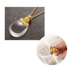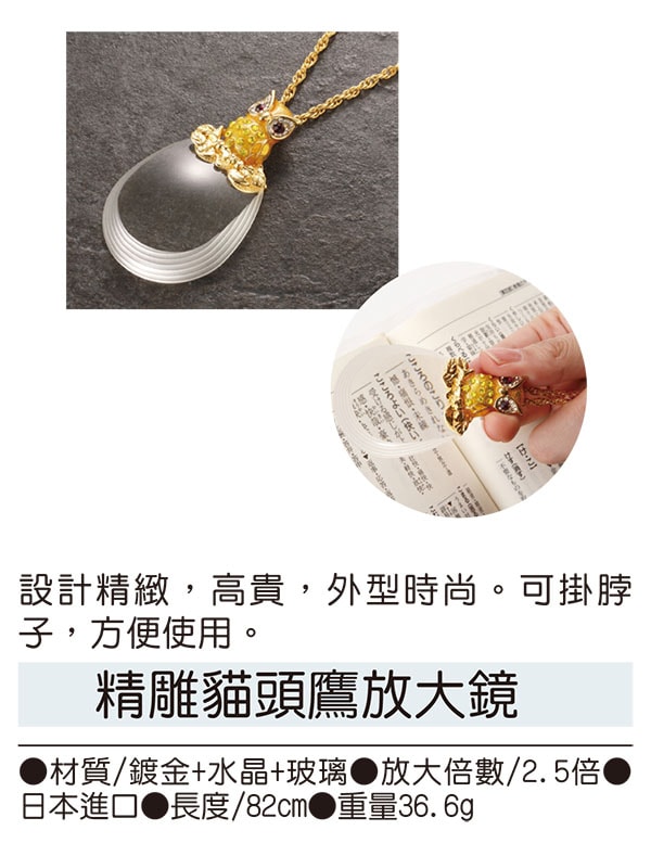 外型時尚。可掛脖子,方便使用。 ●材質/鍍金+水晶+玻璃 ●放大倍數/2.5倍 ●日本進口 ●長度/82cm ●重量36.6g