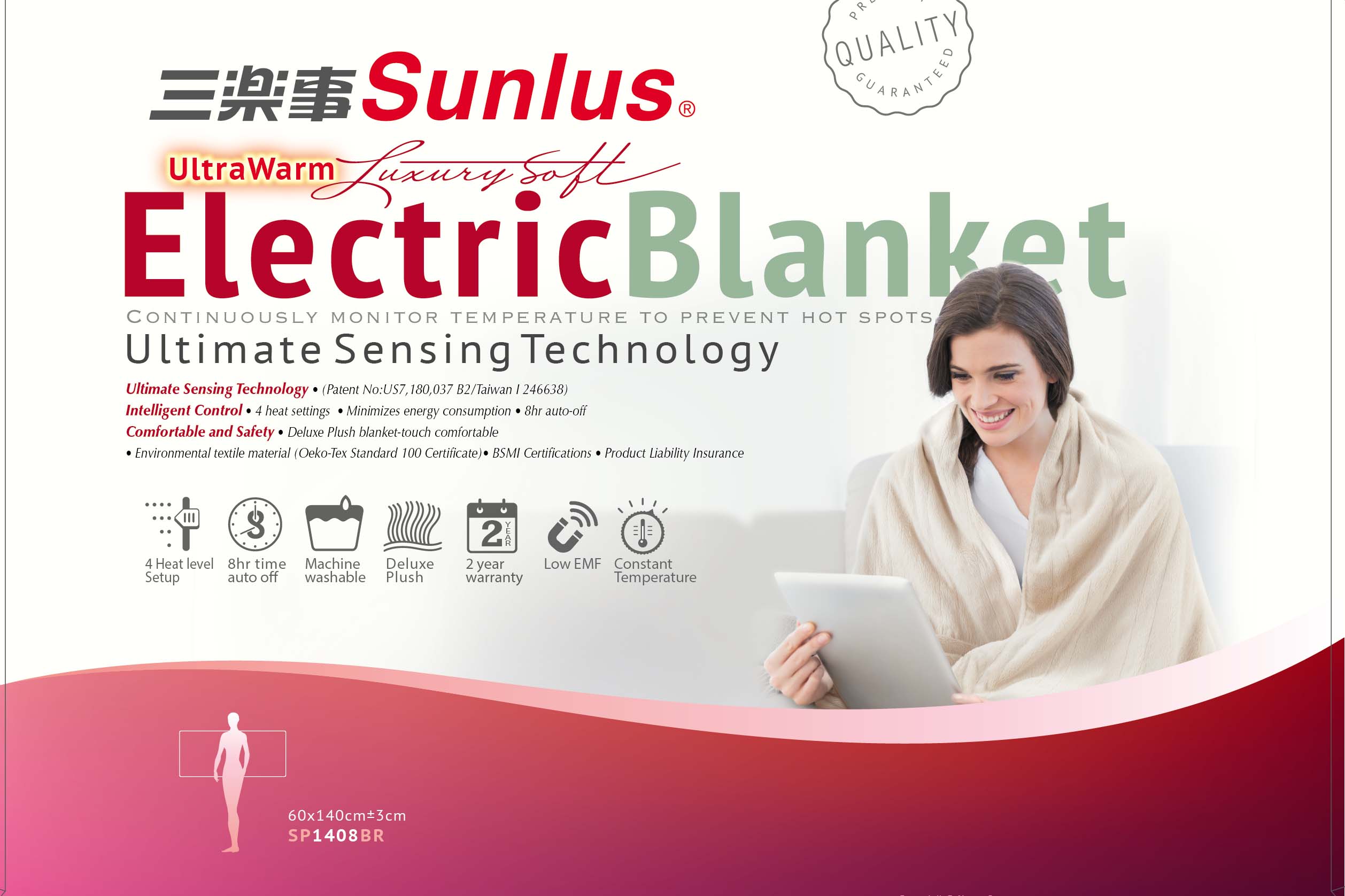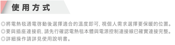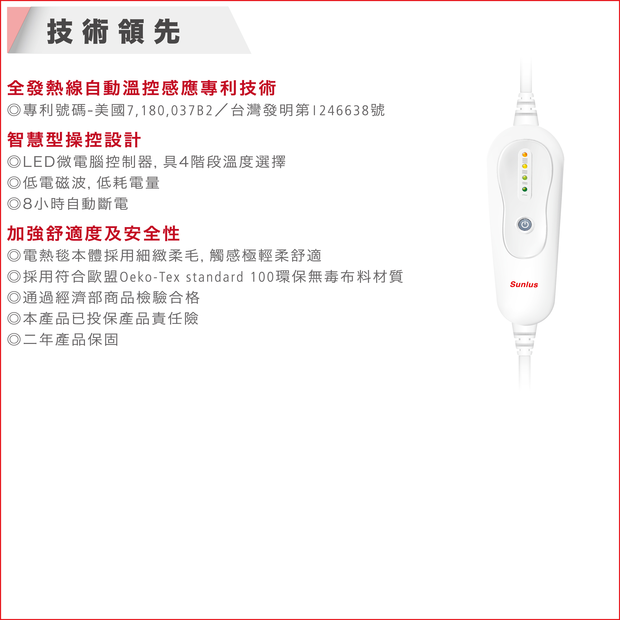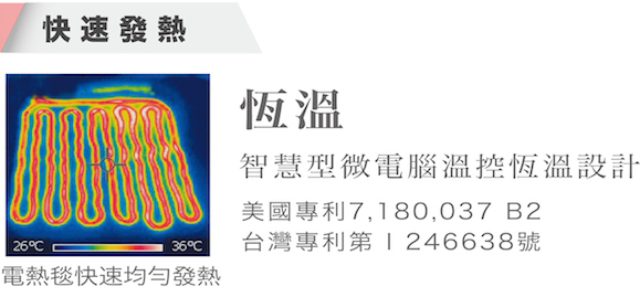 特色: 1.全發熱線自動溫控感應專業技術,安全有保障 2.特殊分離式電線設計,熱敷墊本體可水洗(控制器及電線除外) 3.熱敷墊本體採用細緻絨毛,為環保無毒材質 4.全新升級改良全覆蓋式上蓋設計,溫熱感迅速延伸 5.lED溫度控制器,2小時自動斷電,低耗電量設計,節能環保 6.2年保固,產品責任險一仟萬