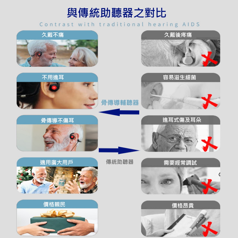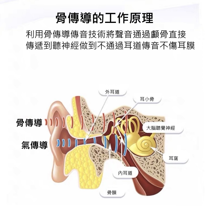 骨傳導固體傳音技術,將聲音通過顱骨傳遞到神經 做到不通過耳道傳遞聲音,不傷耳膜 七種環境音供挑選 可連接手機, 電視, 音響等設備